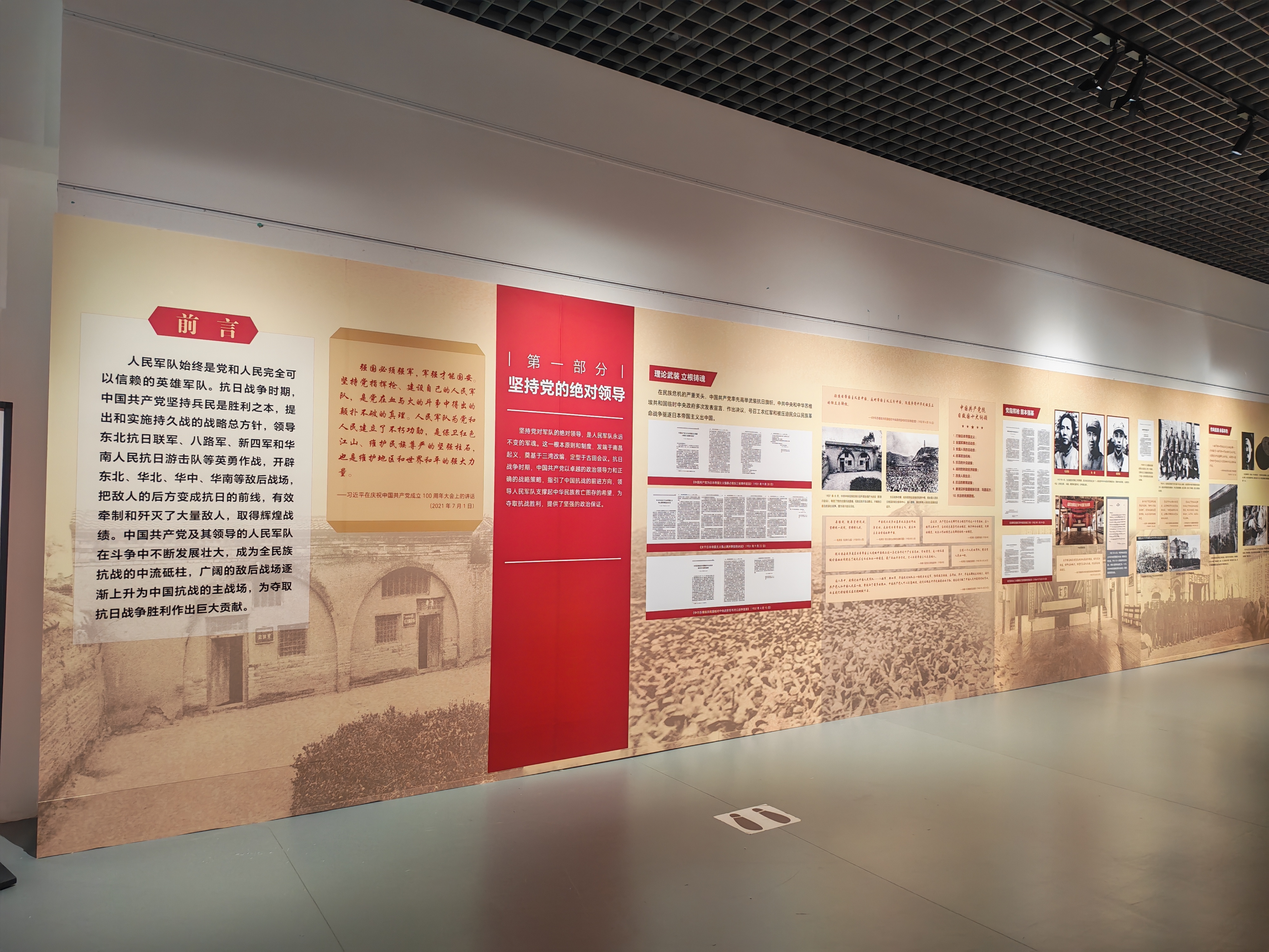 本次展覽分為“堅持黨的絕對領導”“戰斗在白山黑水”“浴血在華北敵后”“華中人民的長城”“華南抗戰的旗幟”“從勝利走向勝利”,共6個部分。展覽生動展現了中國共產黨及其領導的東北抗日聯軍、八路軍、新四軍和華南人民抗日游擊隊等抗日武裝不斷發展、壯大,成為抗戰的中堅力量,并最終取得了抗日戰爭偉大勝利的光輝歷史。