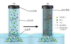 許億博士的研究,目前已進展至能夠利用EGD-PIII&D技術,在內徑細至0.8mm、長超過100mm的石英毛細管的內壁沉積了DLC薄膜,并將該技術拓展至螺旋管、C形管等異形管內壁薄膜的沉積。此外,許億博士針對管內壁DLC薄膜沉積過程中初始階段注入電流快速增長的現象,研究了管內壁材料對等離子體放電的影響,揭示了自增強等離子體放電效應,又對管內壁涂層不均勻的問題設計了多項試驗,最終掌握了管內壁DLC薄膜沉積過程中氣體流量和電壓大小對薄膜均勻性的影響規律。